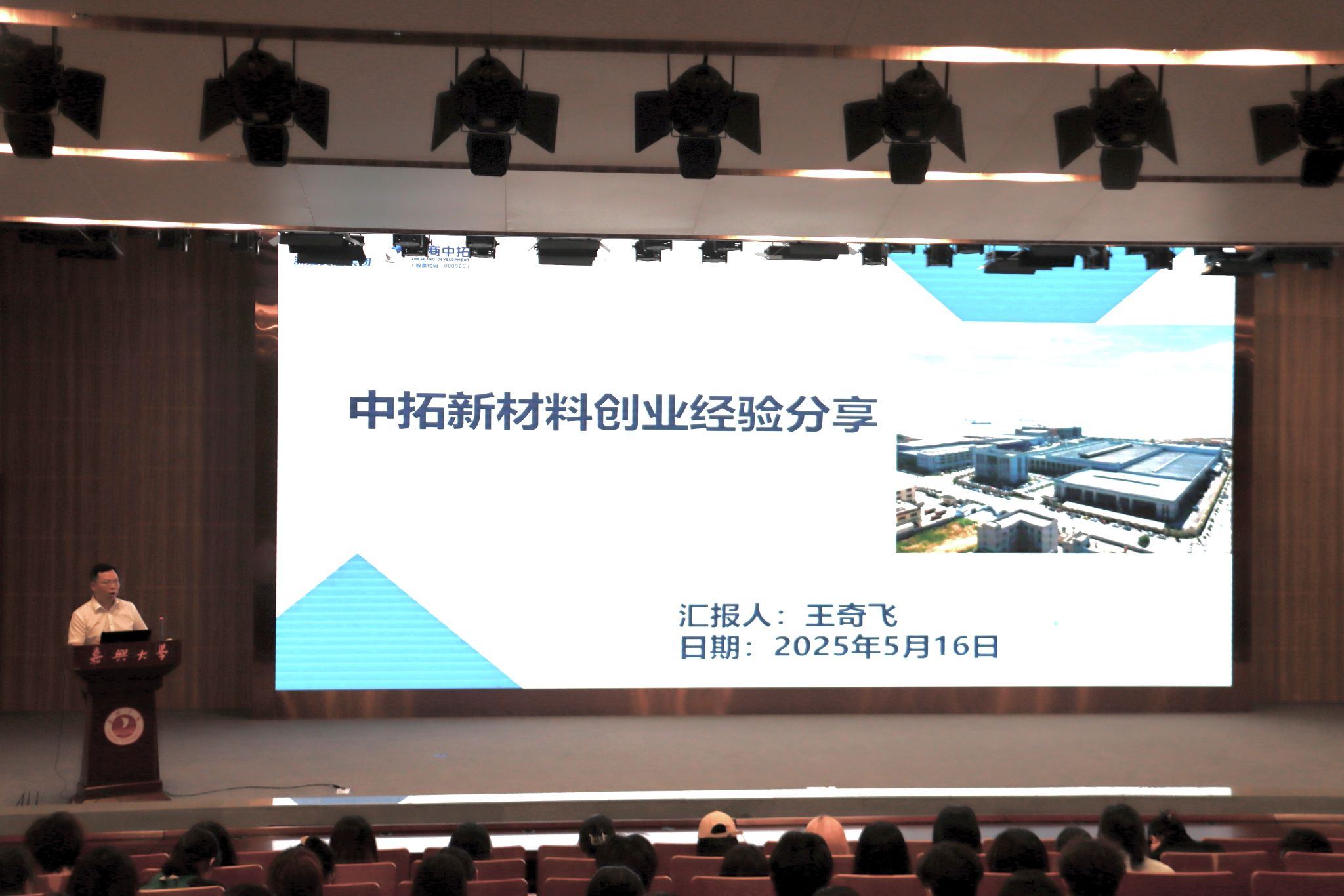 2008届优秀校友王奇飞,并代表学院向他的到来致以热烈的欢迎与诚挚的感谢。在讲座中,王奇飞从校园到职场的角色转变出发,回顾了自己从基层销售到新材料行业坚守深耕的历程。他谈到,创业初期团队曾面临技术瓶颈,通过组建跨学科团队、与高校开展产学研合作等方式,逐步突破困境。“理论知识要落地生根,离不开实践的土壤。”他的话让在场同学对“学用结合”有了更深刻的理解。同时,他以企业管理为例,分享了通过数字化手段优化运营流程的探索,让大家直观感受到科技迭代对产业升级的推动力量。