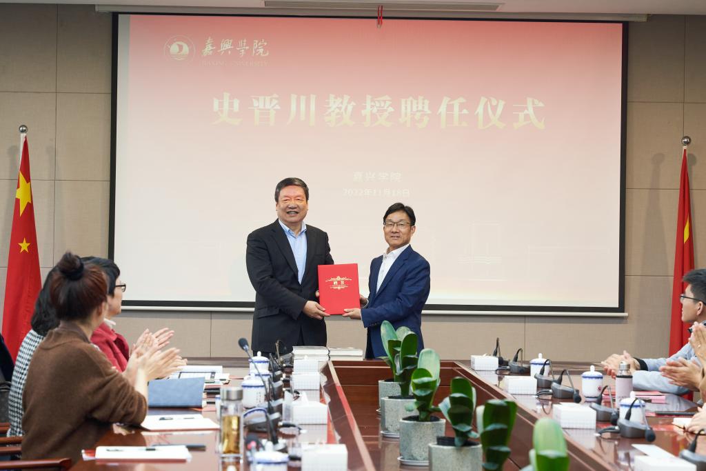 的关键时期,迫切需要像史晋川教授这样的国家级高层次人才的加入和支持,作为著名经济学家、民营经济学术名家和决策咨询专家,史晋川教授的加盟给嘉兴学院经管学科发展注入了强劲的动力,为学校建设有特色、善创新的一流应用型综合性大学创造了有利条件。他希望,史晋川教授能在学科建设、人才培养、师资队伍、科学研究、社会服务等方面为学校经管学科问症把脉、指点迷津、提供支持。他要求,经管学科全体教师要以史晋川教授为榜样,积极对接经济社会发展需求,主动服务国家发展战略,切实提升教书育人、科研创新及社会服务能力,学习史晋川教授为人、治学、做事的优秀品质。