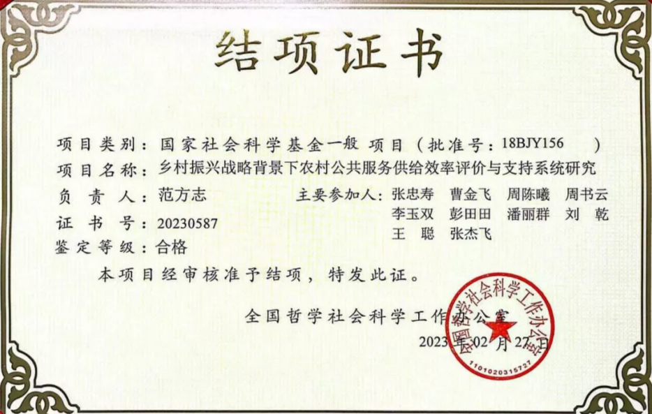 近日,亚洲色吧 范方志教授主持的国家社科基金一般项目“乡村振兴战略背景下农村公共服务供给效率评价与支持系统研究”通过结项验收审批,顺利结项。