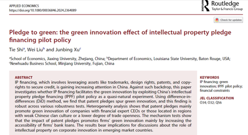 Shi, Tie, Wei Liu, and Junbing Xu. 2024. “Pledge to Green: The Green Innovation Effect of Intellectual Property Pledge Financing Pilot Policy.” Applied Economics,June,1–13. doi:10.1080/00036846.2024.2364089.