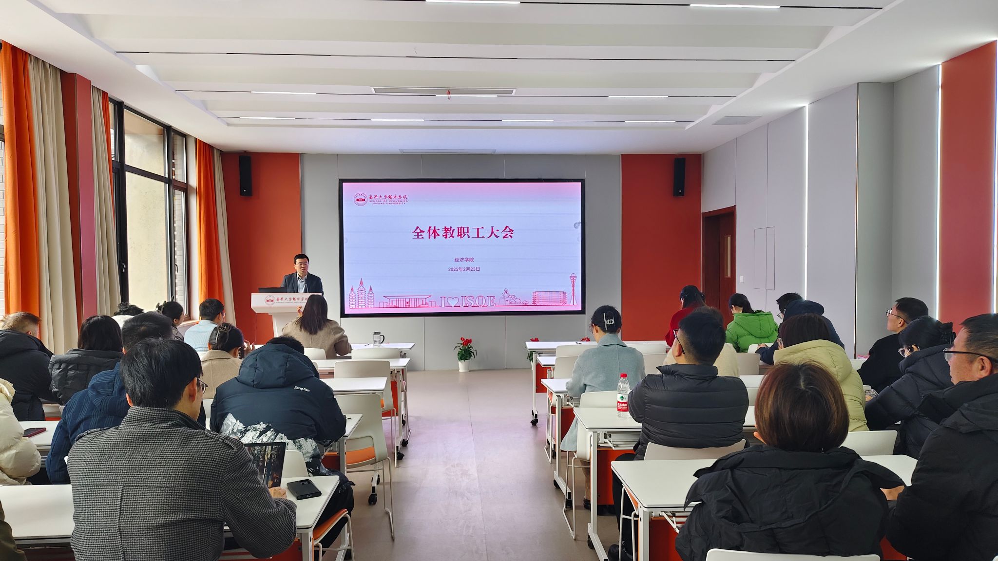 会议首先学习传达了学校2025年工作部署会议精神。院长文雁兵强调,2025年,是“十四五”规划收官、“十五五”规划谋定推进并提前启动实施之年,更是学院在学校高质量发展大背景下,锚定新发展目标,坚持干字当头,跑出“嘉”速度的跨越之年。他要求,一要紧跟形势,横纵比较,学会“看”。全体教师要深入学习贯彻落实《教育强国建设规划纲要(2024—2035年)》、省市“新春第一会”等精神,紧跟国家政策导向,积极适应教育强国、教育强省建设的总体要求,不断提升学院整体办学水平和核心竞争力。二要紧盯重点,善于研究,学会“干”。要汇聚集体智慧,打好人才引育攻坚战,通过对每位教师设计“画像”,做好“体检”,发挥出人才队伍的最大优势;要凝聚全院力量,打好学位点建设攻坚战,通过平台赋能,对标对表,培育出新一轮硕士培育点最佳条件。三要乘势而上,主动出击,学会“谋”。继续深入推进“新经院战略”综合改革,全院上下要进一步解放思想,积极借助外部力量,争取更多资源,通过科学制定“一系一表”,指标任务落实落细,力争在2025年实现高质量发展任务新突破!