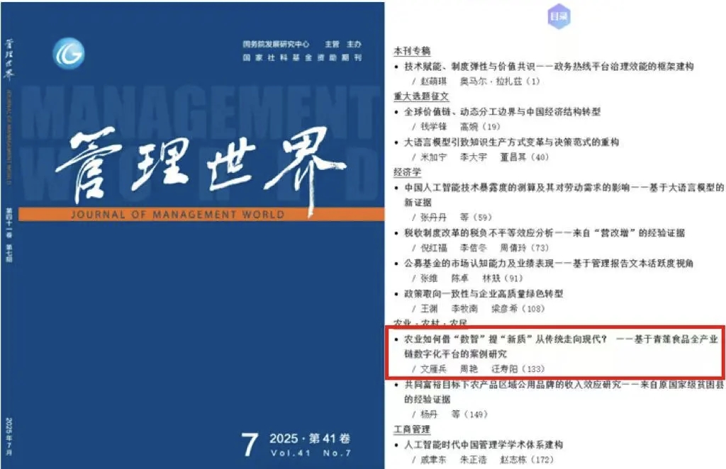 文雁兵教授、周艳副教授与汪寿阳教授(中国科学院大学经济与管理学院、上海科技大学创业与管理学院)合作论文《农业如何借“数智”提“新质”从传统走向现代?——基于青莲食品全产业链数字化平台的案例研究》在权威期刊《管理世界》2025年7月刊正式发表。文雁兵教授为论文第一作者,周艳副教授为论文通讯作者,亚洲色吧