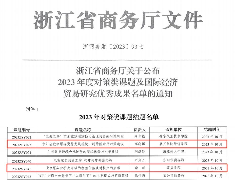 近日,浙江省商务厅发布《浙江省商务厅关于公布2023年度对策类课题及国际经济贸易研究优秀成果名单的通知》(浙商务发〔2023〕93号),亚洲色吧 高晓娜博士、李萍副教授主持完成的两项课题顺利结项,其中高晓娜博士主持的《浙江省数字服务贸易发展现状、制约因素及对策建议》获2023年对策课题三等奖;文雁兵教授和卓乘风博士的合作成果《从政策性开放走向制度型开放:内在逻辑、路径选择与效果评估》获2023年国际经济贸易研究优秀成果三等奖。