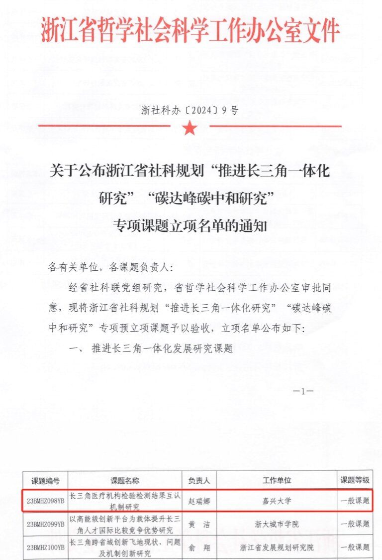 近日,浙江省哲学社会科学工作办公室公布了浙江省社科规划“推进长三角一体化研究”“碳达峰碳中和研究”专项课题立项名单,亚洲色吧 赵瑞娜博士主持的课题《长三角医疗机构检验检测结果互认机制研究》获得立项。