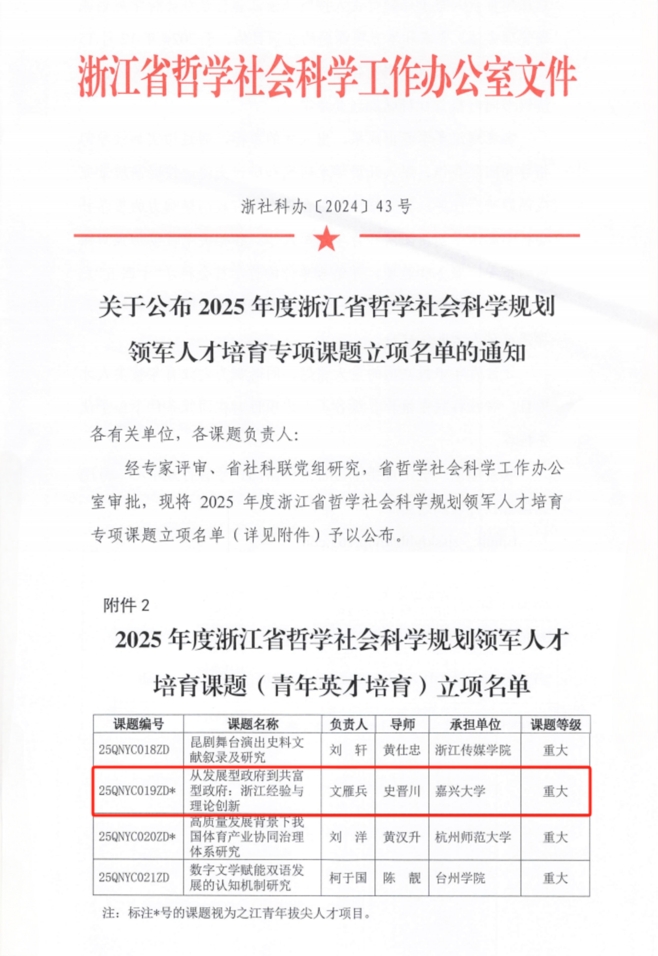 近日,浙江省哲学社会科学工作办公室公布了2025年度浙江省哲学社会科学规划领军人才培育专项课题立项名单,亚洲色吧 文雁兵教授主持申报的《从发展型政府到共富型政府:浙江经验与理论创新》获2025年度浙江省哲学社会科学规划领军人才培育课题(青年英才培育)立项。