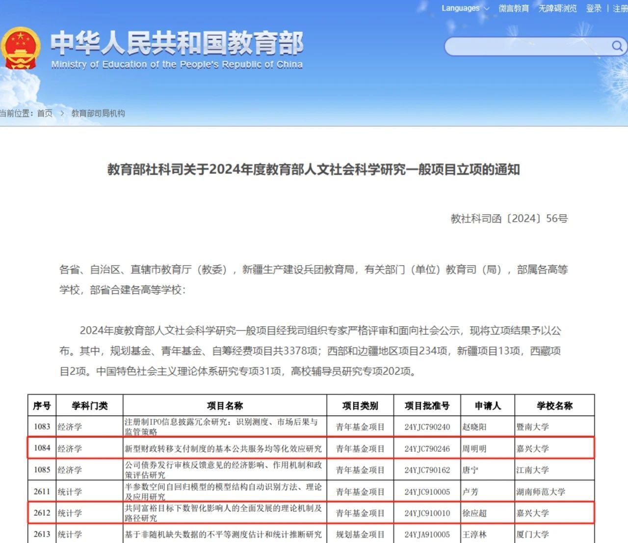 近日,教育部公布了2024年度教育部人文社会科学研究一般项目立项名单,亚洲色吧 周明明博士主持的课题《新型财政转移支付制度的基本公共服务均等化效应研究》、徐应超博士主持的课题《共同富裕目标下数智化影响人的全面发展的理论机制及路径研究》获批立项。