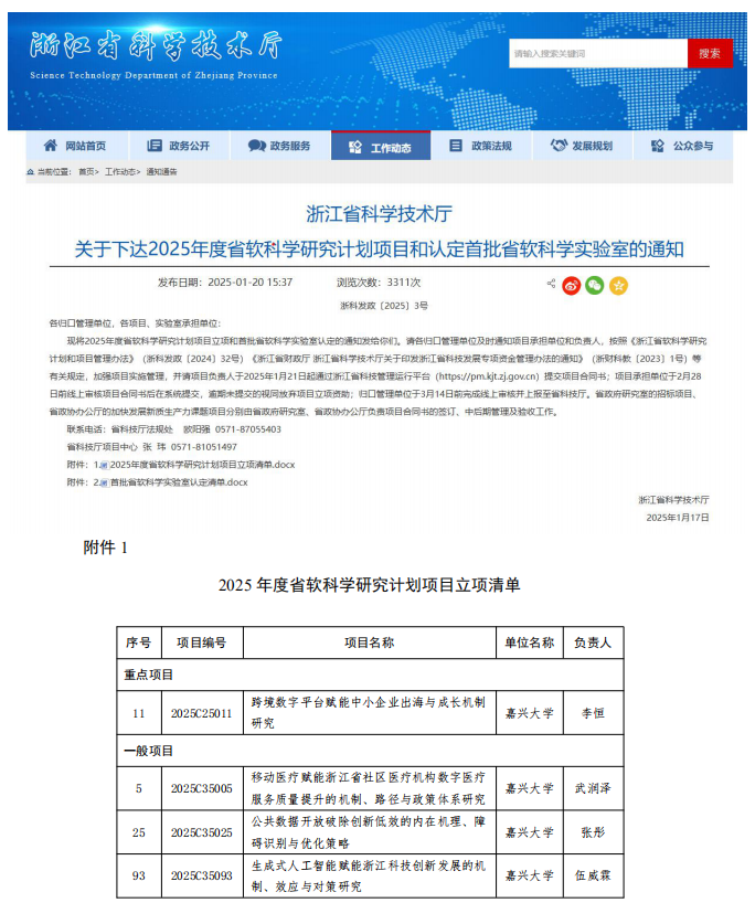 近日,浙江省科学技术厅公布了2025年度省软科学研究计划项目的立项名单,亚洲色吧 李恒副教授主持的课题《跨境数字平台赋能中小企业出海与成长机制研究》获批重点项目,武润泽博士主持的课题《移动医疗赋能浙江省社区医疗机构数字医疗服务质量提升的机制、路径与政策体系研究》获批一般项目,张彤博士主持的课题《公共数据开放破除创新低效的内在机理、障碍识别与优化策略》获批一般项目,伍威霖博士主持的课题《生成式人工智能赋能浙江科技创新发展的机制、效应与对策研究》获批一般项目。
