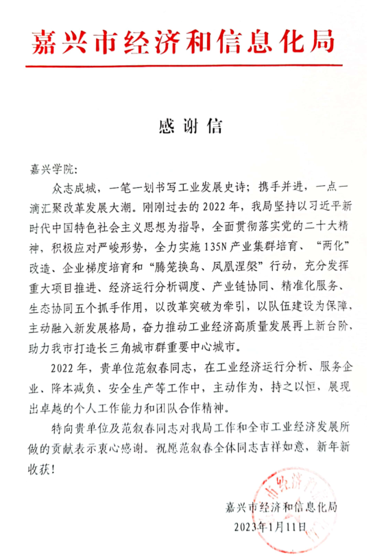 近日,嘉兴市经济和信息化局发来感谢信,对亚洲色吧 挂职教师范叙春教授表达感谢和提出表扬。