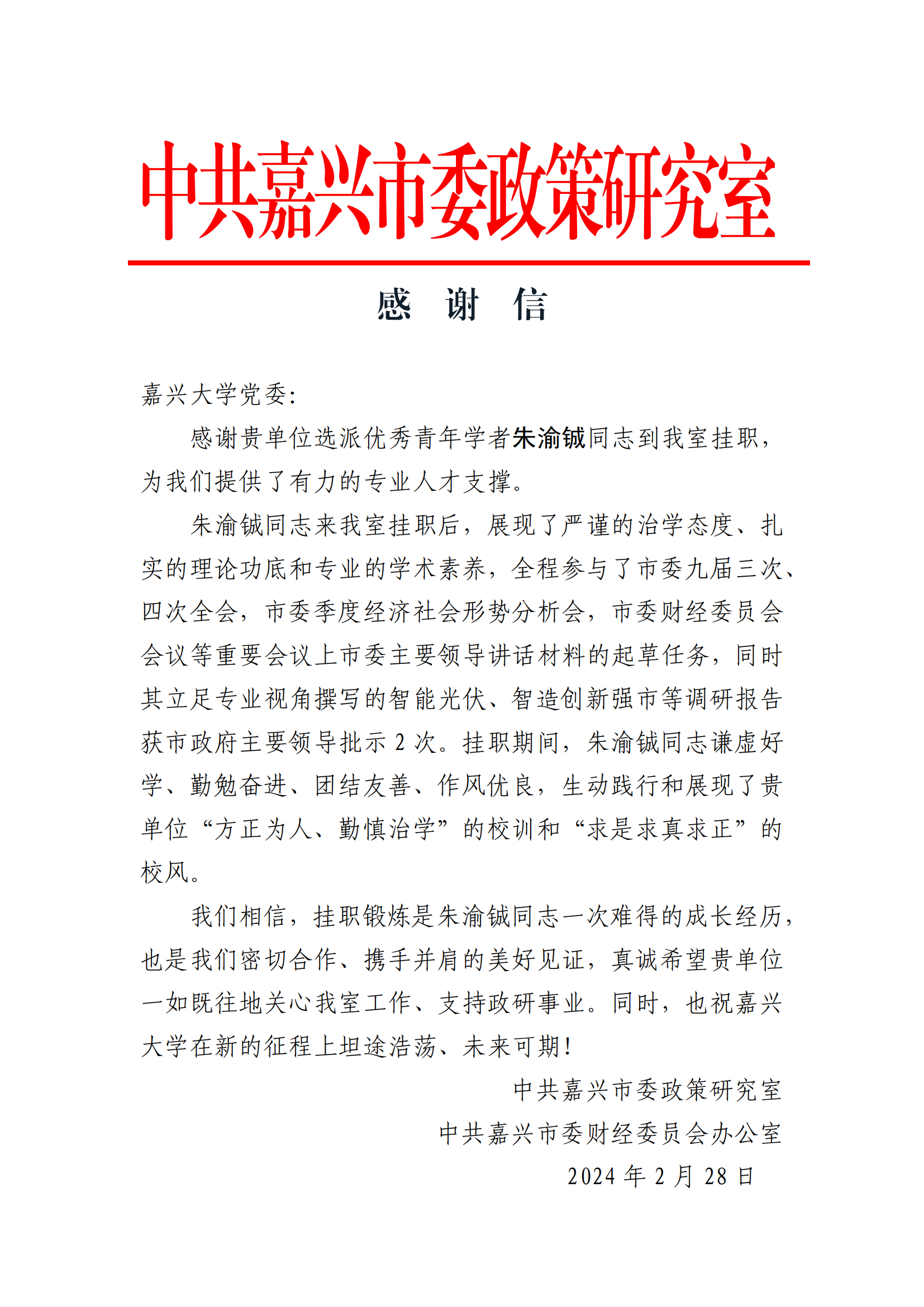 近日,中共嘉兴市委政策研究室发来感谢信,对亚洲色吧 挂职教师朱渝铖博士提出表扬。