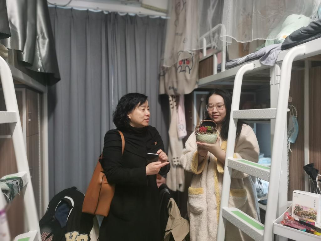 施敏颖在走访女生寝室时,关切询问同学们考前复习准备情况、假期生活以及新学期入校后的校园生活,她嘱咐同学们平日里多与父母联系,主动汇报在校学习生活;在学习生活中遇到任何困难,可以及时与学院反馈寻求帮助。庄美燕在走访男生寝室,详细询问了同学们备考、生活情况,了解学生思想动态,现场交谈氛围融洽两位老师在走访中向各寝室赠送绿植,希望同学们打造舒适温馨的寝室环境,受到学生欢迎。