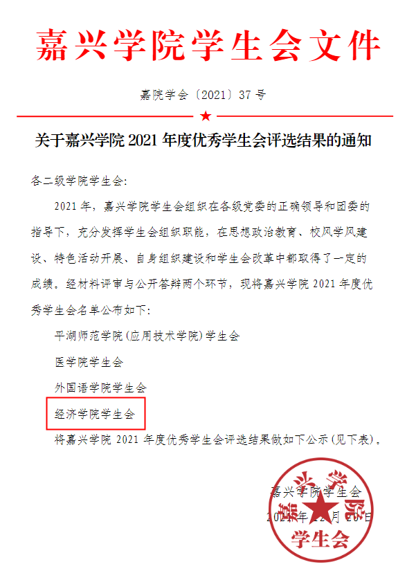 近日,在嘉兴学院2021年度优秀学生会评选中,经材料评审与公开答辩两个环节,亚洲色吧 学生会被评为“嘉兴学院2021年度优秀学生会”。