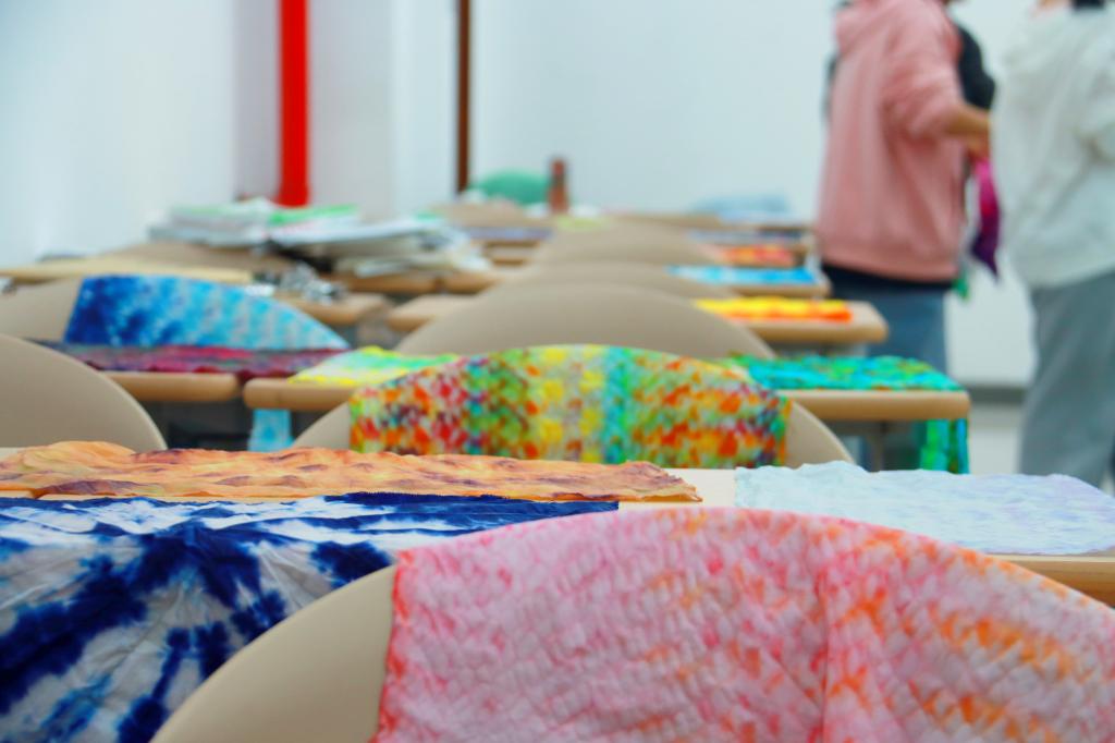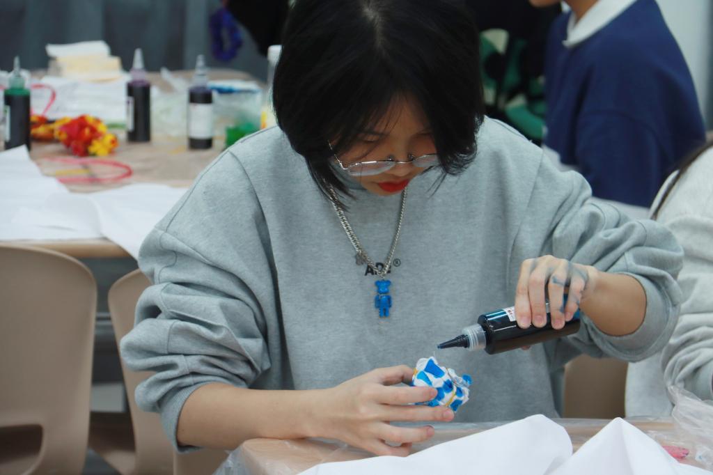 首先,同学们各自尝试制作丝巾扎染,云朵纹、螺旋纹的各类图案融合了学员们的奇思妙想和绚丽的色彩搭配,一条条丝巾似开盲盒般,掀开真容。负责人在旁也是细心指导学员们在制作过程中所遇到的问题。卷卷舒舒,滴滴点点,在学员们的欢声笑语中,一张张独具特色的丝巾,排列在桌上,铺就成美丽的画卷。