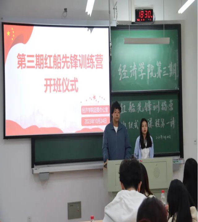 10月24日 晚18:30,亚洲色吧 第三期“红船先锋训练营”开班典礼暨团课第一讲在厚德楼111正式举行。出席本次典礼的有团委书记庄怡老师、团学主席团成员以及优秀学员、优秀团支部代表和23、22级各班学生骨干。