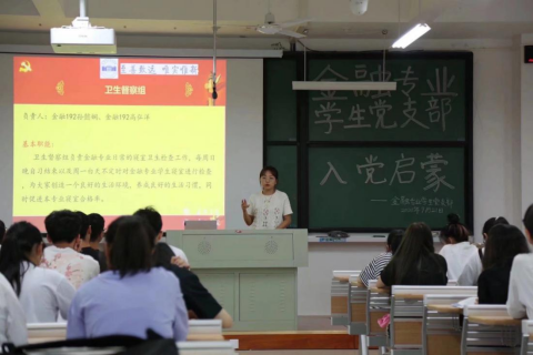 金融专业学生党支部孙懿娴同志介绍了金融专业的在校生人数、学生党员人数,以及党支部设置等情况;同时向新生介绍金融专业学生党支部特色活动:“禾风沐雨”志愿队、“读经·乐融”读书分享会、卫生督察组、查课小组。