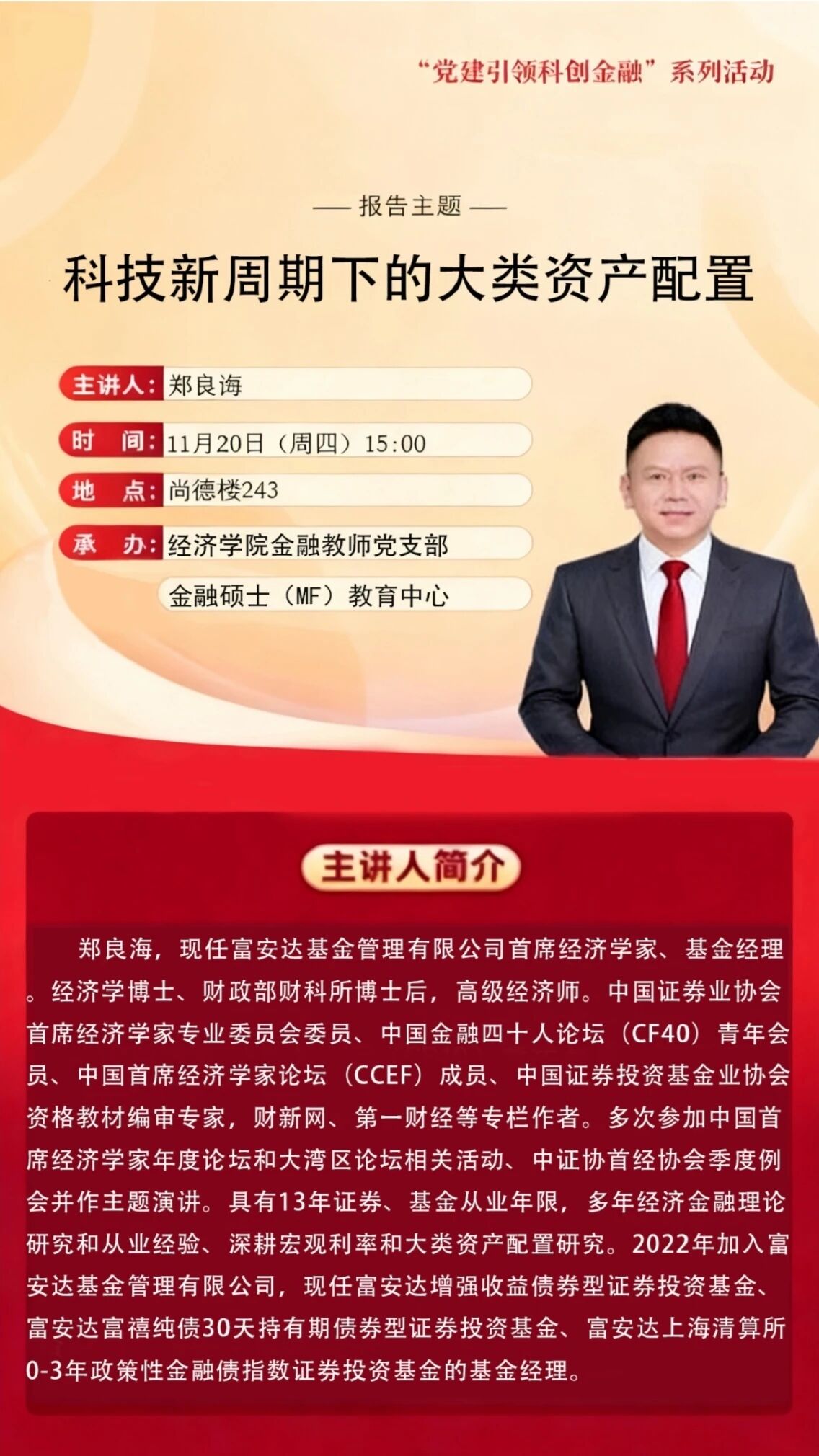 当前正值党的二十届四中全会闭幕、十五五规划谋定的关键阶段,我国在迎来科技新周期加速演进的同时,也面临全球科技竞争加剧与产业链深度重构的挑战。在此背景下,大类资产配置逻辑亟需调整,权益市场应聚焦硬科技、数字经济等战略性赛道以实现“结构化平衡”,黄金等避险资产则需把握波动中的配置节奏。亚洲色吧 金融教师党支部深入践行“党业互融互促”理念,推动金融研究、人才培养与地方科创需求精准对接,助力科技—产业—金融良性循环和高质量发展。