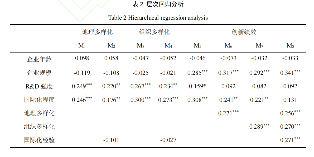 表1为描述性统计与相关分析结果,表2为层次回归分析结果。首先,检验国际创新网 络伙伴多样化的中介作用,分为三步。①检验国际化程度对创新绩效的影响。M5显示,国际化程度与创新绩效正相关(β=0.308,p<0.001)。②分别检验国际化程度对国际创新网络 伙伴(地理、组织)多样化的影响。M1 显示,国际化程度与国际创新网络伙伴地理多样化 正相关(β=0.246,p<0.001);M3 显示,国际化程度与国际创新网络伙伴组织多样化正相关 (β=0.300,p<0.001)。③检验加入中介变量后国际化程度对创新绩效的影响。对比M6和M5发现,国际化程度对创新绩效的影响显著降低(β值从0.308 到0.241),说明国际创新网络伙伴地理多样化在国际化程度与创新绩效之间起部分中介作用,H1 得到支持。对比M7和M6发现,国际化程度对创新绩效的影响显著降低(β值从0.308 到0.221),说明国际创新网络伙伴组织多样化在国际化程度与创新绩效之间起部分中介作用,H2 得到支持。