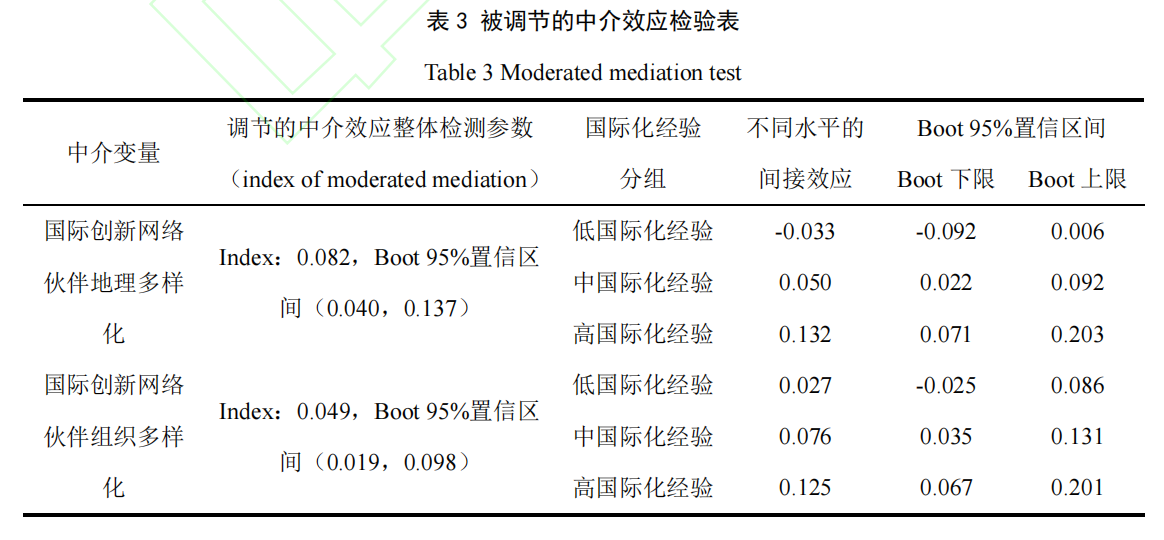 最后,检验被调节的中介。采用 SPSS 的 PROCESS 插件分两步运算(见表 3)。①当以国际创新网络伙伴地理多样化为中介变量时,调节的中介参数为0.082,其 Boot 95%置信区间为(0.040,0.137),不包括0;同时对于高国际化经验企业,国际化程度通过国际创新网络伙伴地理多样化对创新绩效的影响显著(β=0.132,Boot 95%置信区间不包括0),而对于低国际化经验企业,这种间接效应不显著(Boot 95%置信区间包括 0)。因此,国际创新网 络伙伴地理多样化的中介效应受到国际化经验的调节,H5a 得到支持。②对于国际创新网络 伙伴组织多样化的中介效应,调节的中介参数为0.049,其Boot 95%置信区间为(0.019,0.098),不包括0;同时高国际化经验企业的间接效应显著(β=0.125,Boot 95%置信区间不包括0),低国际化经验企业的间接效应不显著(Boot 95%置信区间包括 0)。因此,国际创新网络伙伴组织多样化的中介效应受到国际化经验的调节,H5b 得到支持。