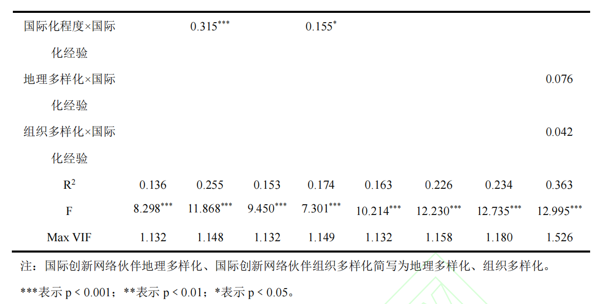 国际创新网络伙伴(地理、组织)多样化与创新绩效间关系的调节效应(见表 2)。M2 显示,国际化经验与国际化程度的交互项对国际创新网络伙伴地理多样化具有正向影响(β=0.315,p<0.001),H3a得到支持。M4显示,国际化经验与国际化程度的交互项对国际创新网络伙伴 组织多样化具有正向影响(β=0.155,p<0.05),H3b 得到支持。M8显示,国际化经验与国际创新网络伙伴地理多样化的交互项(β=0.076,p>0.1)、国际化经验与国际创新网络伙伴组织多样化的交互项(β=0.042,p>0.1)均对创新绩效不具有显著影响,H4a、H4b 未得到支持。
