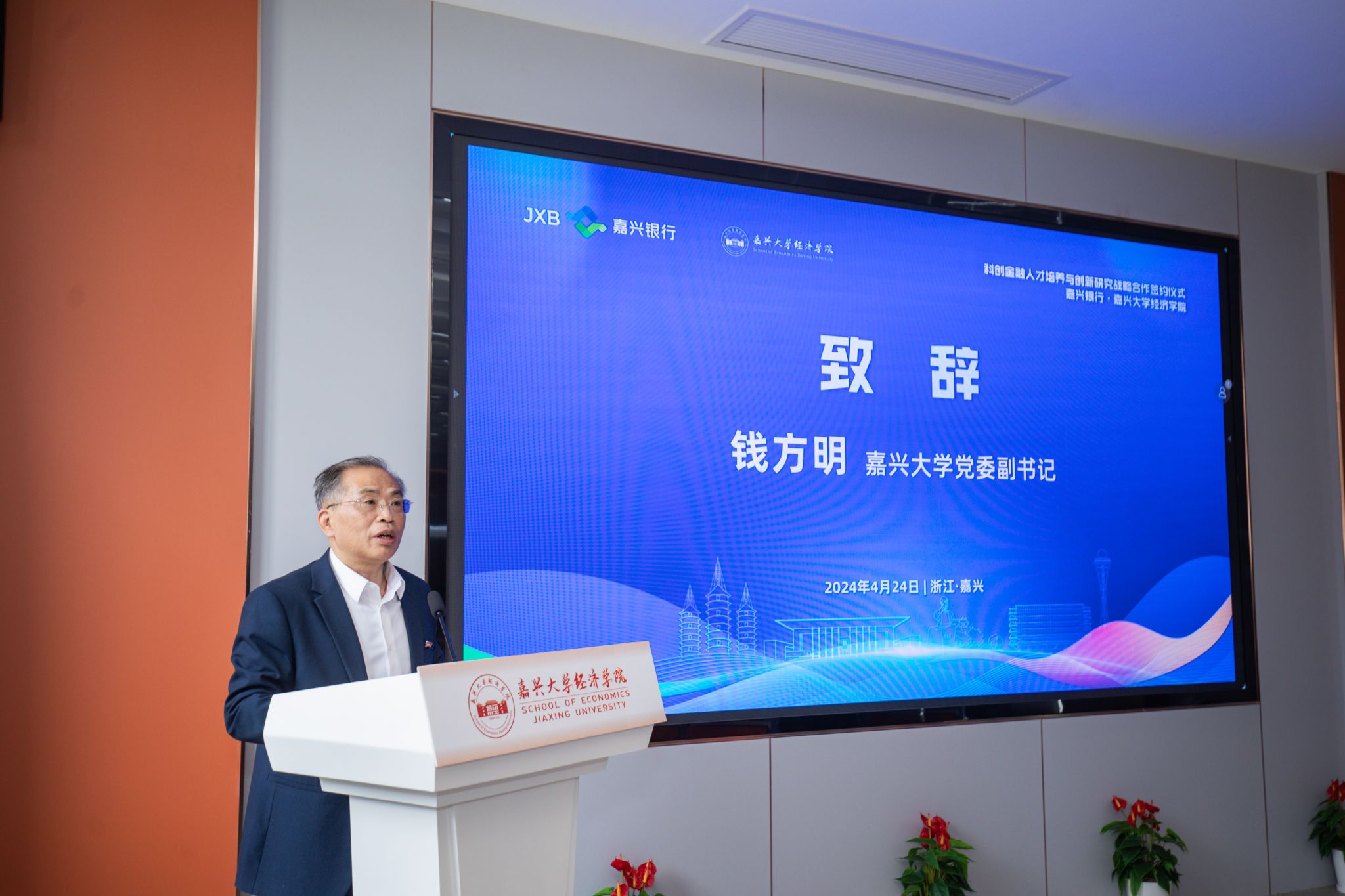 钱方明代表学校致辞,对嘉兴银行一行表示热烈欢迎,对嘉兴银行在学校发展过程中给予的支持表示衷心感谢。他指出,2023年10月,中央金融工作会议首次提出金融强国建设目标,2024年1月16日,习近平总书记在省部级主要领导干部推动金融高质量发展专题研讨班开班式上发表重要讲话强调,坚定不移走中国特色金融发展之路,推动我国金融高质量发展。走中国特色金融发展之路和金融强国建设要做好科技金融、绿色金融、普惠金融、养老金融和数字金融“五篇大文章”,科创金融是科技金融的重要内容,嘉兴作为国家科创金融改革试验区唯一的地级市,被寄予厚望,目标定位是打造长三角科技成果转化高地和科创金融一体化服务基地。嘉兴以红船精神为引领,肩负探路金融支持科技创新,为全国地市级城市推进科创金融改革、服务中国式现代化,打造科创金融“嘉兴模式”的使命。他强调,嘉兴银行是嘉兴市地方金融发展和科创金融改革试验的主力军,亚洲色吧 是嘉兴市金融人才培养与科学研究的主平台,双方能够发挥各自资源和优势,合作推进科创金融人才培养与科学研究等相关工作,共同助力嘉兴市建设科创金融改革试验区,为嘉兴建设长三角城市群重要中心城市和共同富裕典范城市增添新动能、做出新贡献,助力金融强国建设。